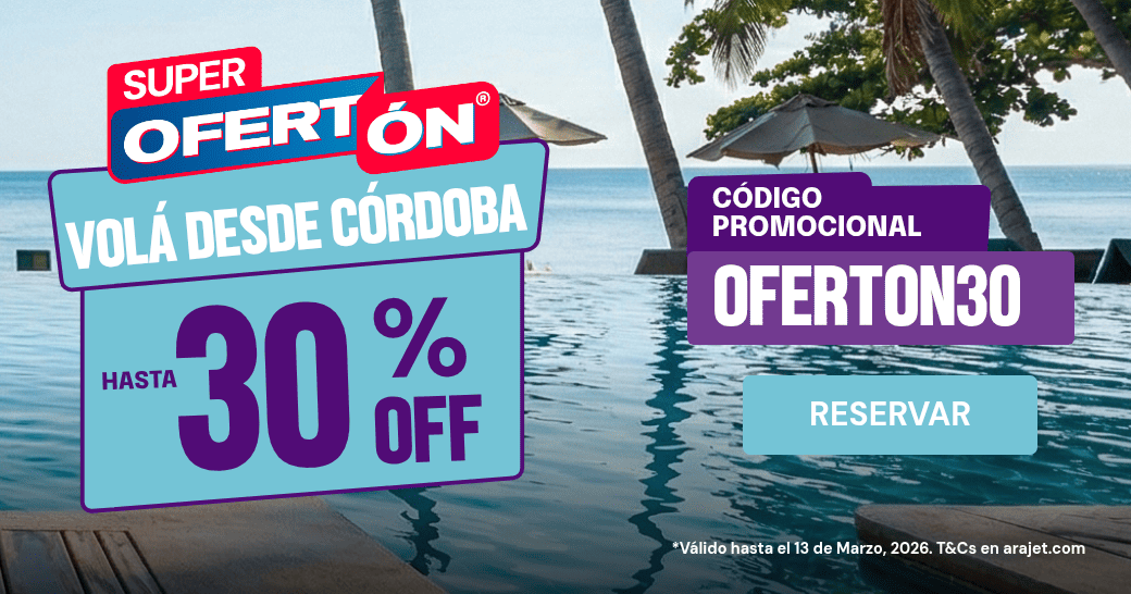Arajet inició una campaña de promoción denominada “Super Ofertón” que aplica descuentos de hasta el 30% en la tarifa base para rutas internacionales con origen en el Aeropuerto Internacional Ingeniero Aeronáutico Ambrosio Taravella de Córdoba. La oferta está disponible para compras realizadas entre este 9 de marzo y el 13 de marzo próximo.