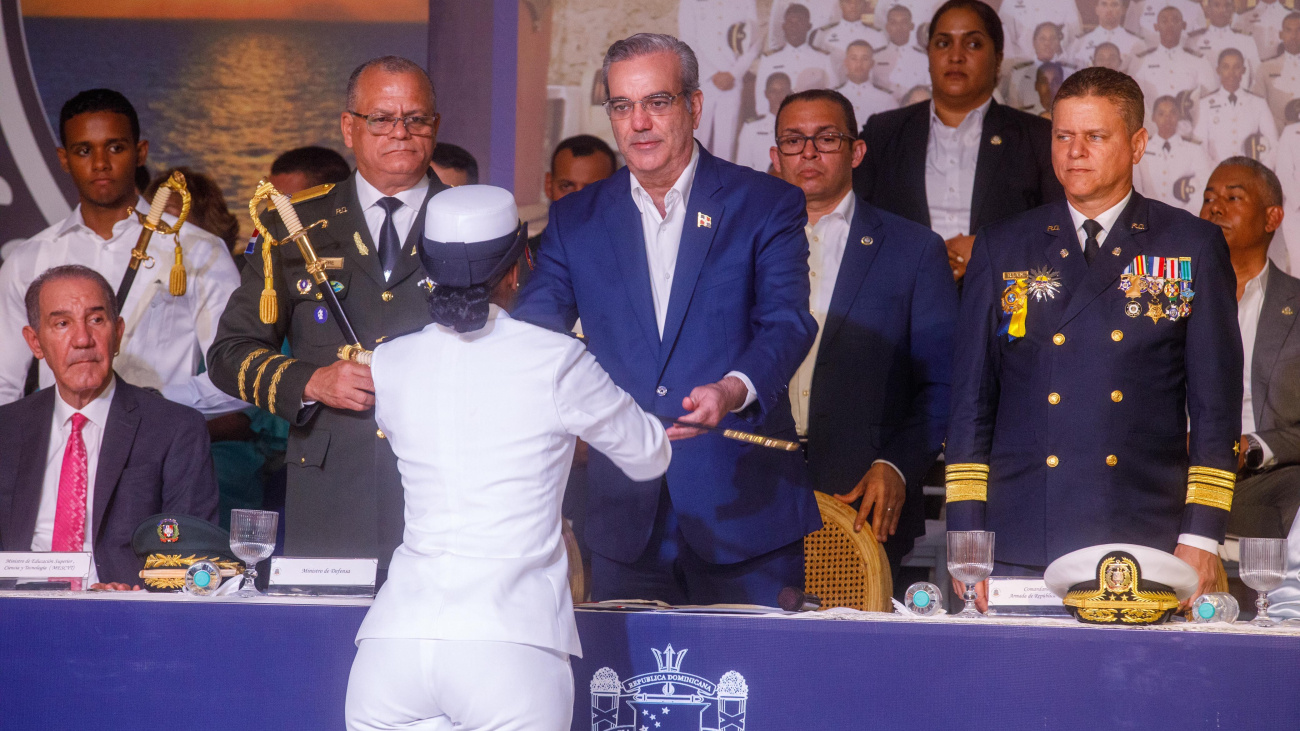 El presidente Luis Abinader encabezó esta ceremonia de LXXIII Promoción de Damas y Caballeros Guardiamarinas, clase 2020-2024, a quienes tomó juramento y entregó el sable de mando.