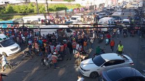 Dicho accidente que también dejó a ocho ciudadanos lesionados, ocurrió exactamente a las 7:40 de la mañana en la intersección de la avenida Manolo Tavarez Justo y la calle Pedro Clisante, al pie del puente peatonal de la entrada al sector Padre Las Casas.
